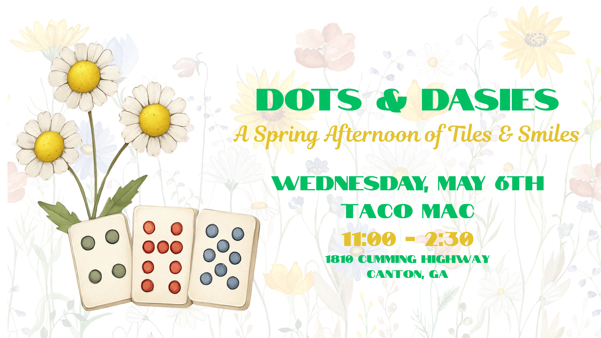 Join us for Dots & Daisies Open Play, a charming Mahjong Circle gathering where friends, fun, and springtime blooms come together. This event welcomes players of all levels for a relaxed, social afternoon of strategy, laughter, and delightful company. Enjoy the game, savor light bites, and celebrate a season of friendship in full bloom.
